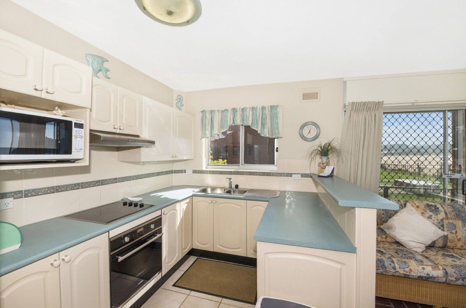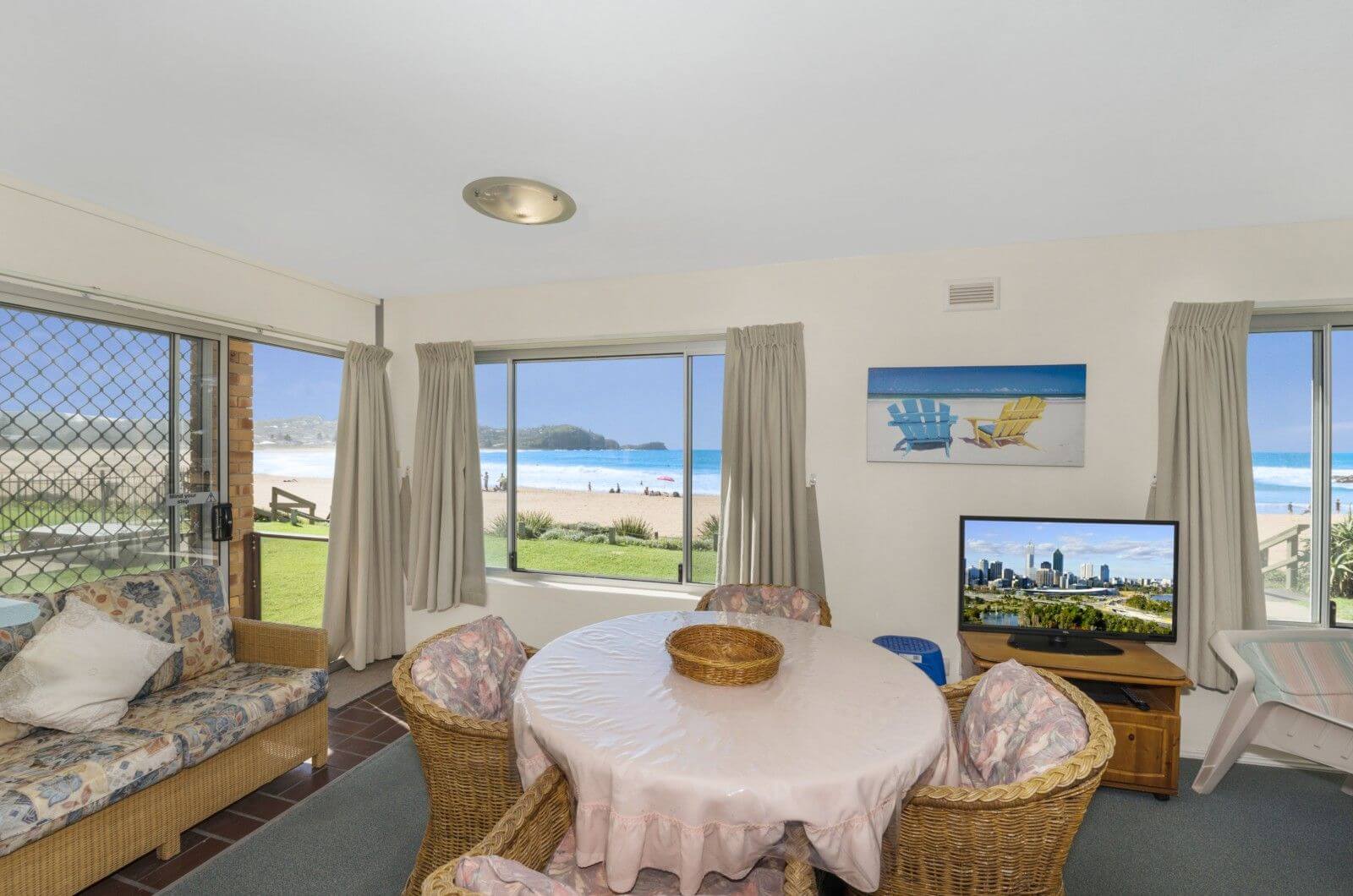 This comfortable apartment has a stunning view of the beach from the open plan lounge/dining room. Enjoy your breakfast soaking up the morning sun and watching the waves roll in!