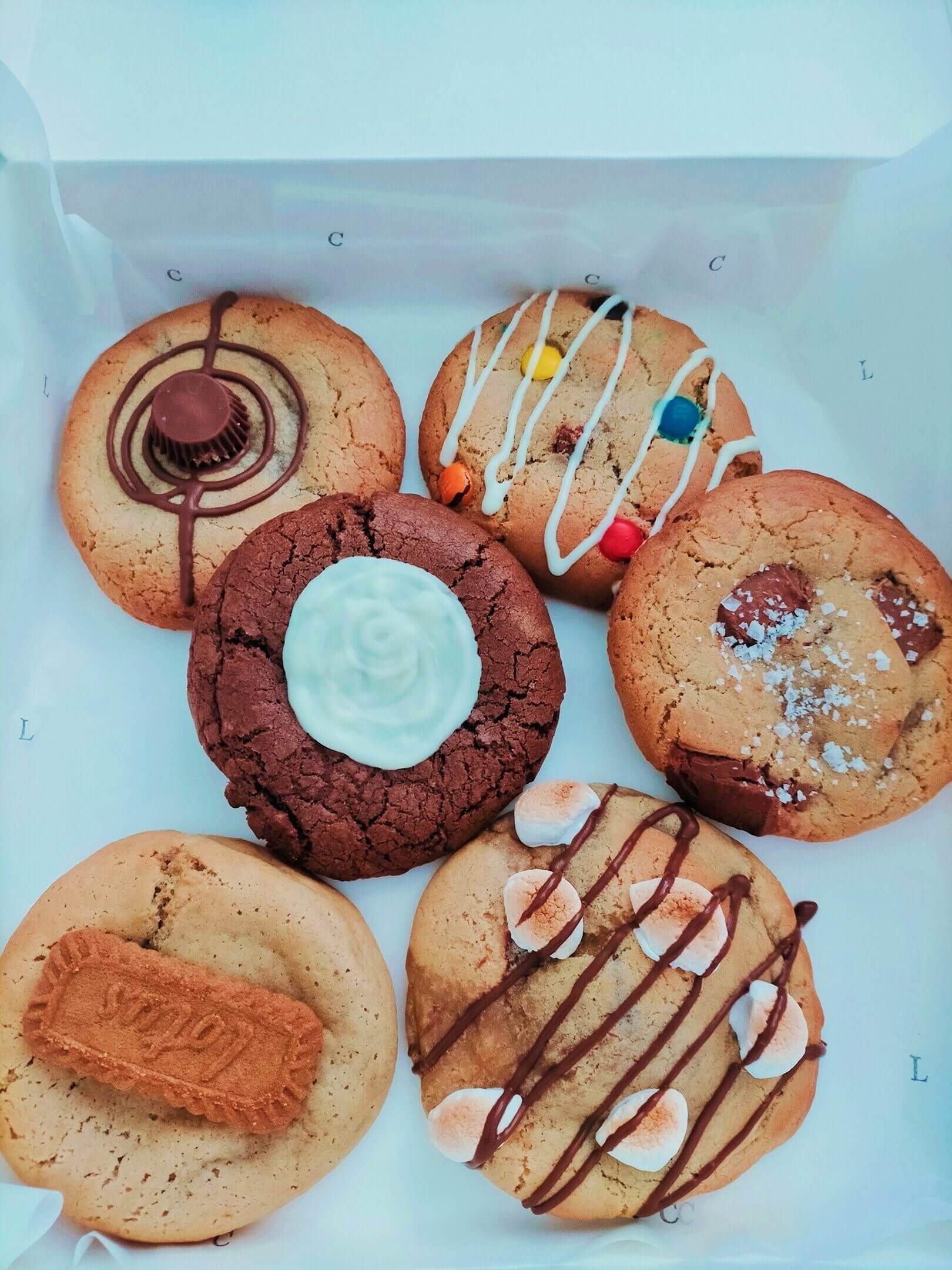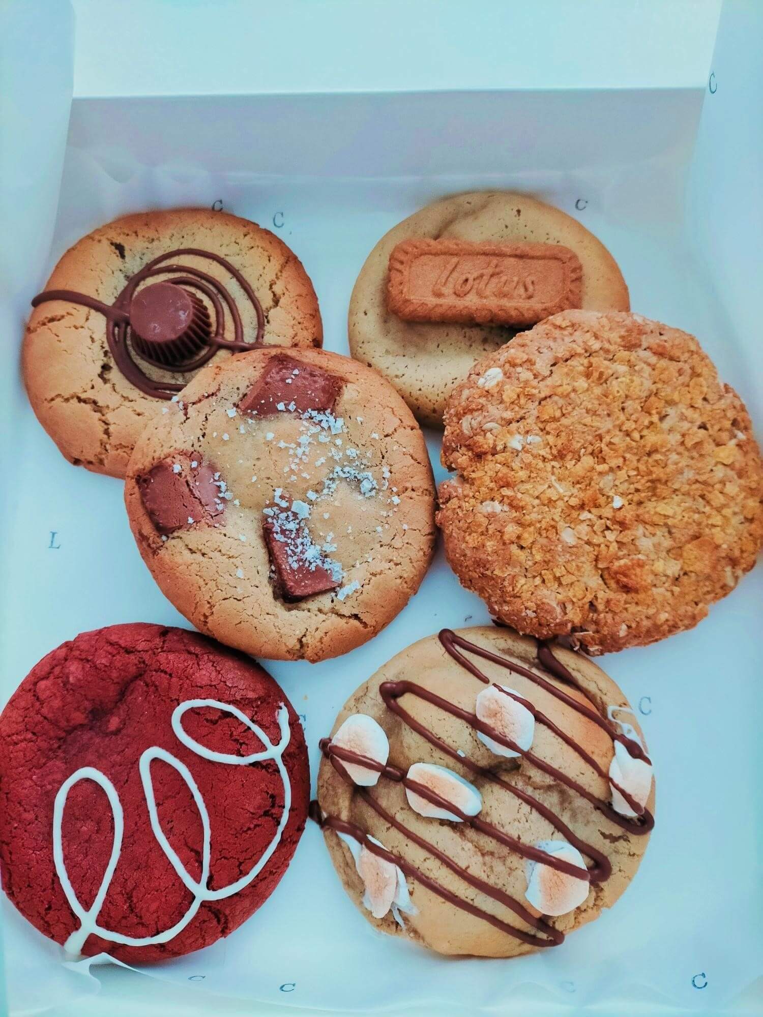Each delicious cookie is $6. Buy a box of five and you’ll get another one of your choice for free, and the best thing is that you can make up your own box with your own personal mix of favourite flavours.