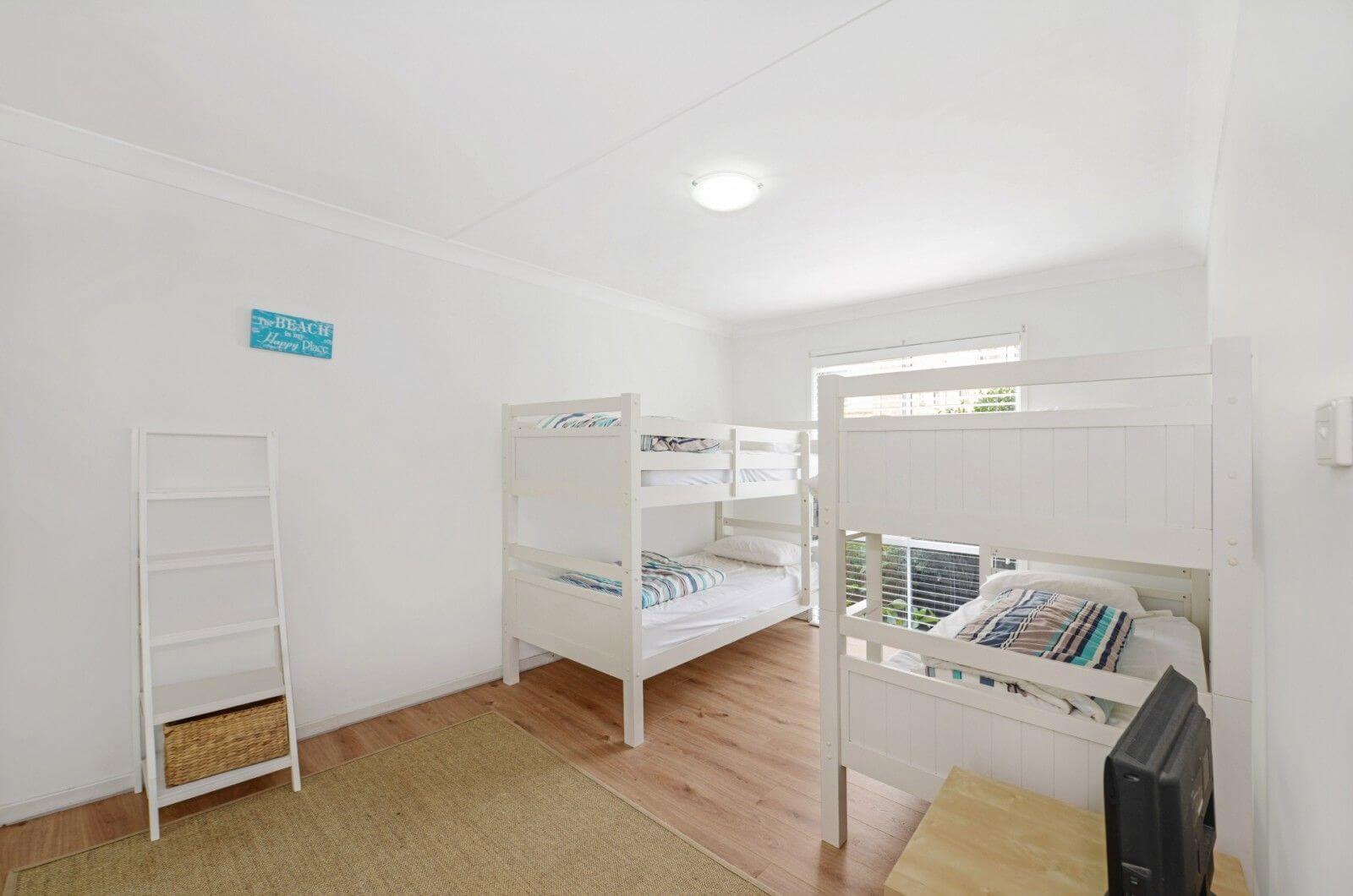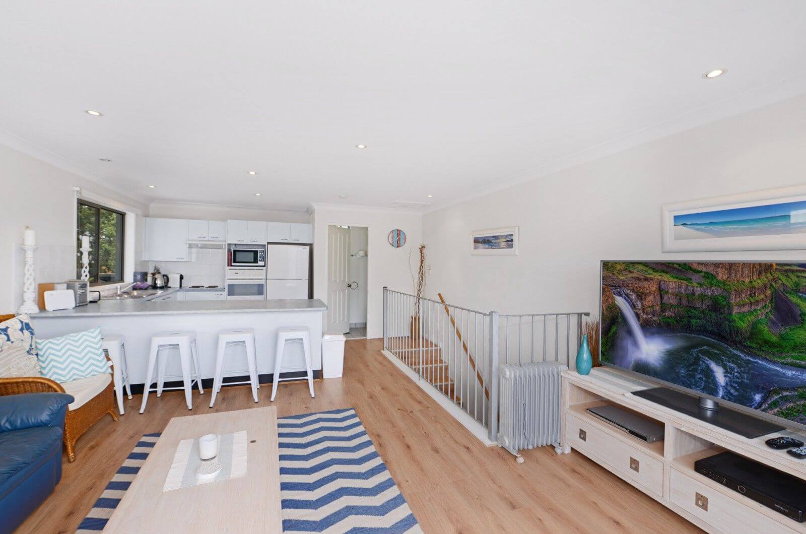 Entry level has the main bedroom with queen size bed and ensuite, bedroom two has two sets of bunks and bedroom 3 has a double sofa bed and television. Main bathroom with bath and shower. The kitchen is located upstairs. The lounge room has a television, and opens onto the deck with views of the lagoon and North Avoca Beach. There is an extra powder room upstairs with the laundry. Linen not provided.