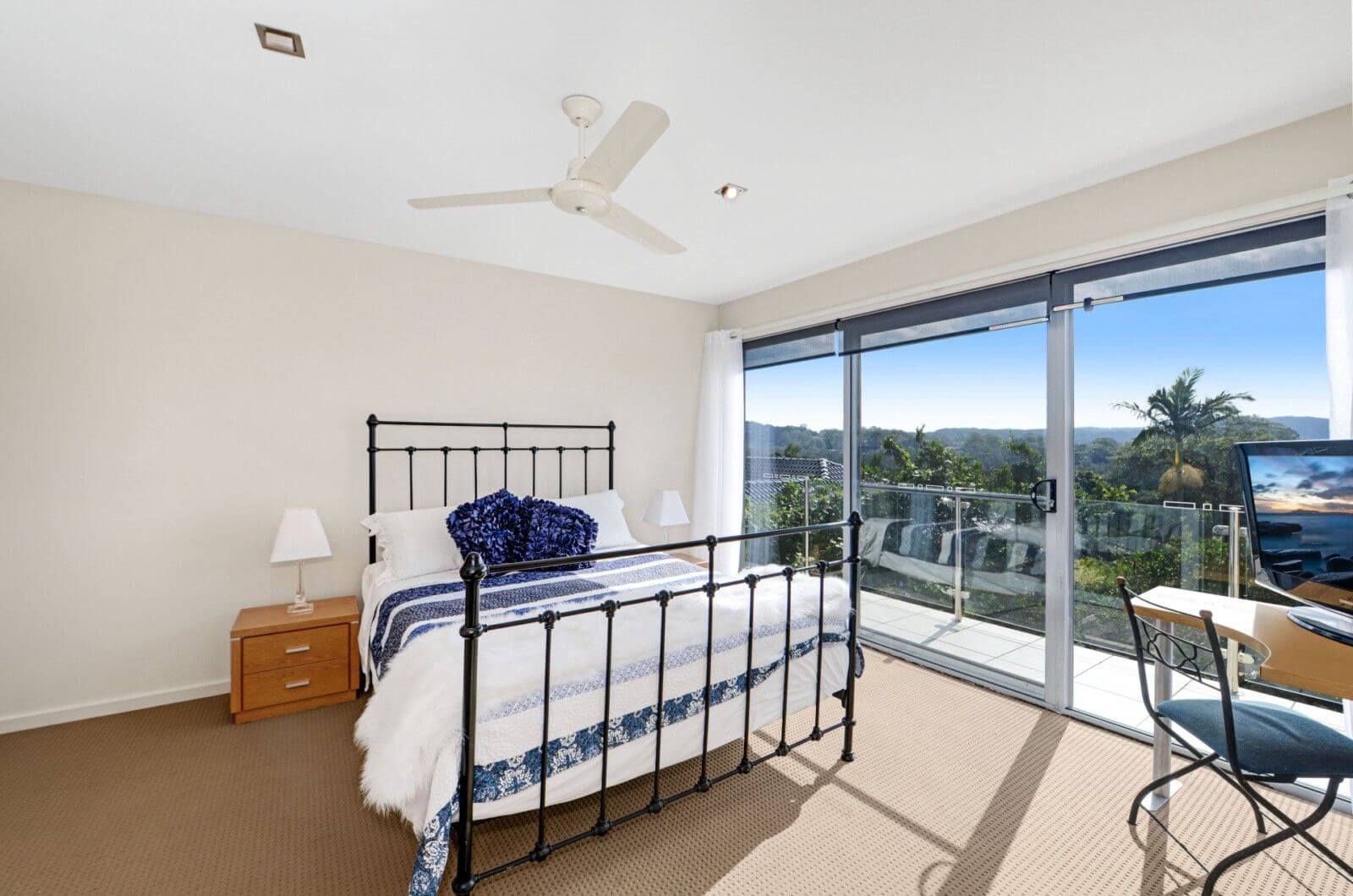 Upstairs is the kitchen, living areas and main bedroom with an ensuite. The main bedroom has a queen size bed. The open plan kitchen and living area also has air conditioning and views of the lake and the ocean.