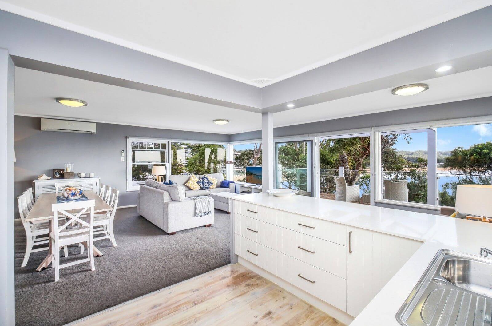 Out on the extensive deck or patio, relax to the sound of the ocean and watch the awesome sight of Ospreys patrolling along the cliff, and the sparkling ocean stretching forever. Add a champagne and cheese platter and you won't want to leave! However if you must, the beach, cafes, restaurants, children's playground and the iconic Avoca Beach Theatre are all a few minutes stroll down the hill.