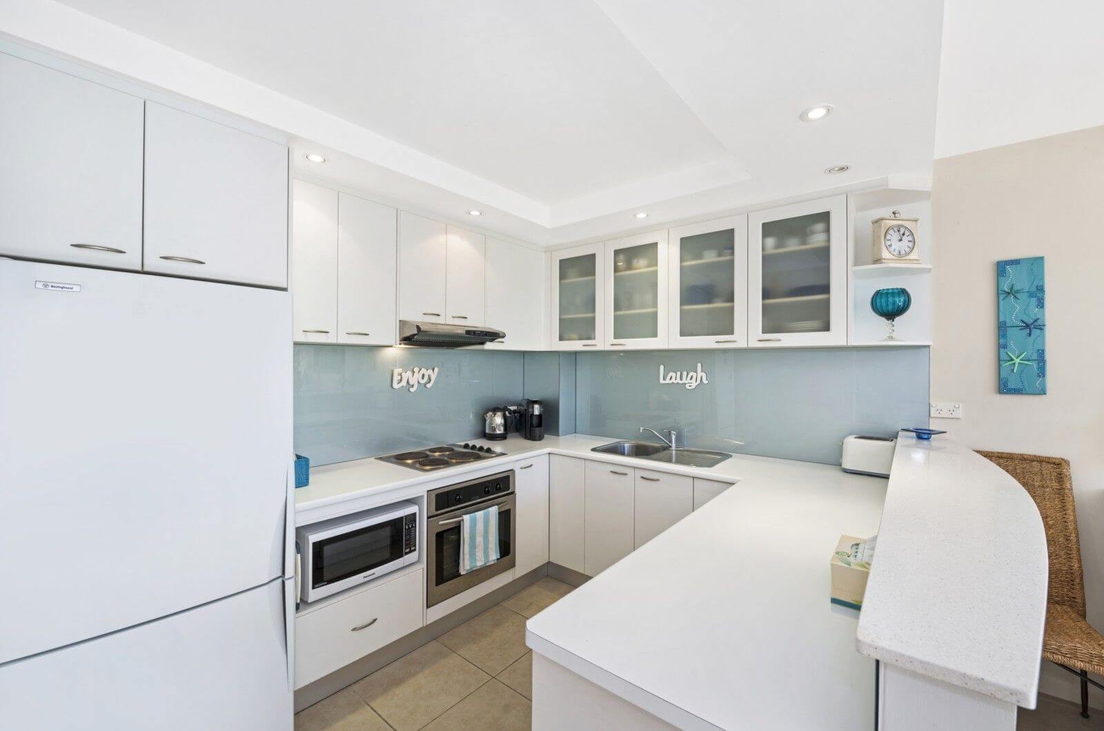 Modern kitchen with microwave and glass splashbacks. Functional, open plan living and dining opening to outdoor entertaining terrace.