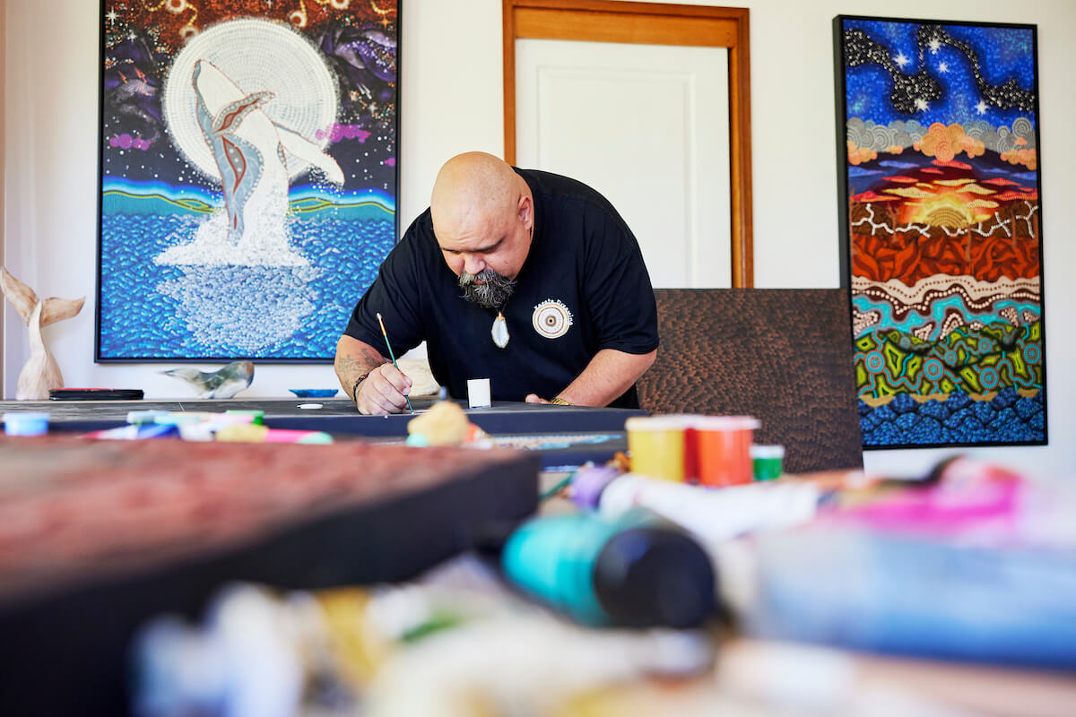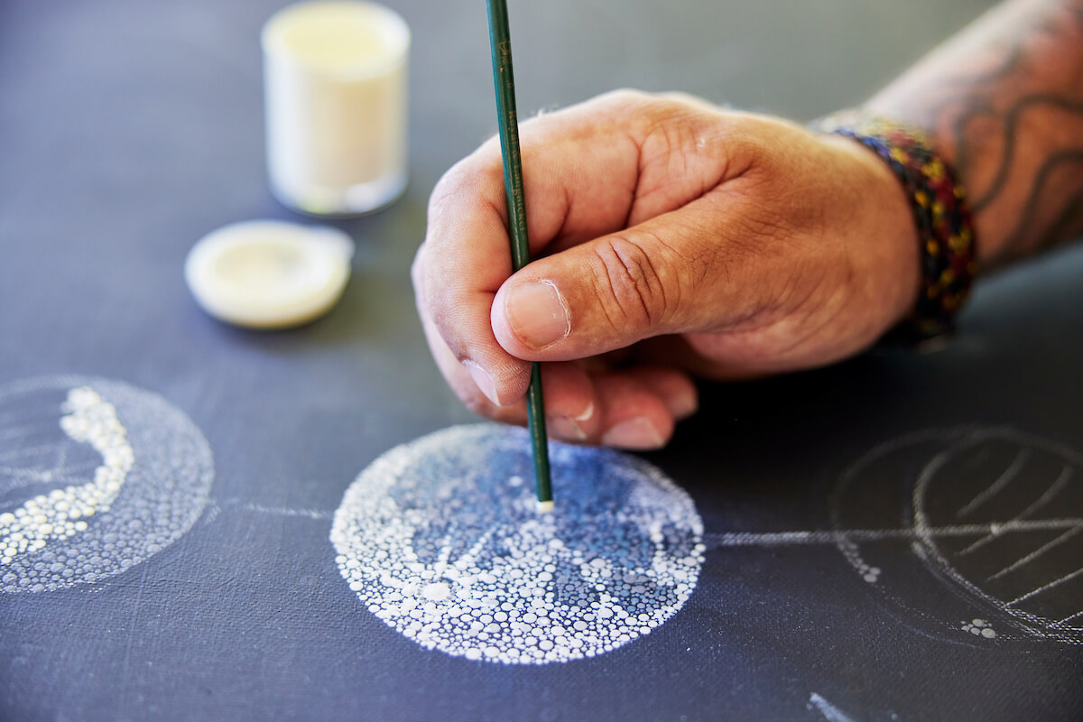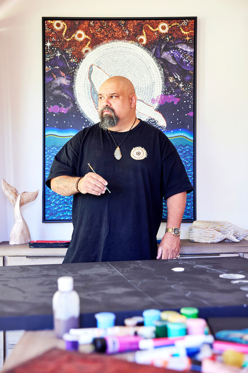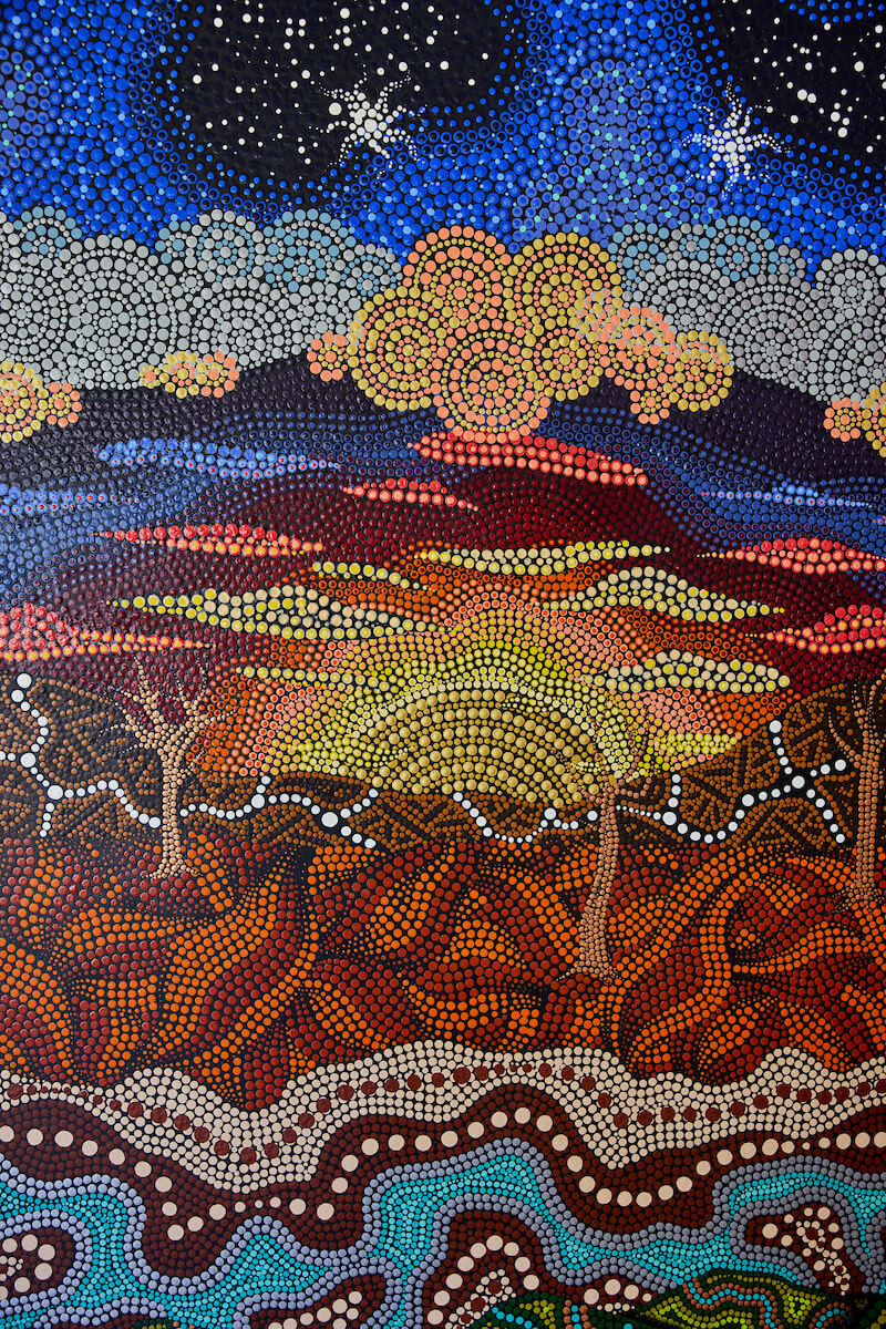 Garry is an Aboriginal artist of proud Dharawal, Bidjigal and Dhungutti descent. Recently a finalist in the Gosford Art Prize, he only discovered his love and talent for painting a few years ago! The former musician who has a passion for rock and heavy metal, likens the rhythm and pattern of painting to his style of drumming. He first moved to the Central Coast in 2010 and is now based in Kariong, near Brisbane Water National Park, with his wife and three sons.