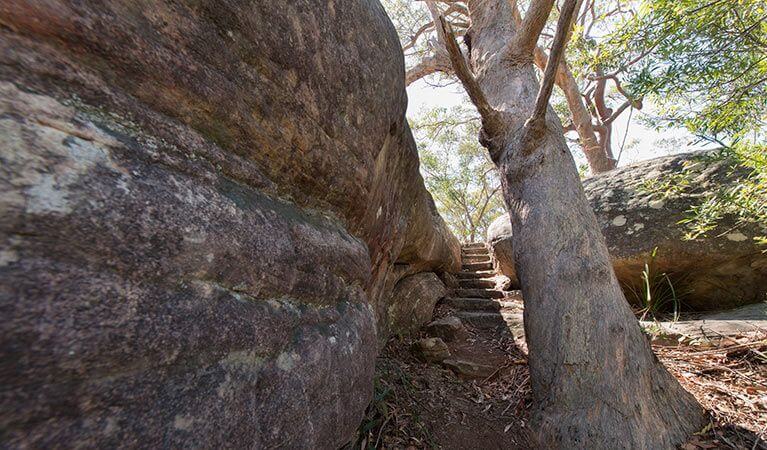 This challenging walk passes through diverse landscapes, including rainforest, grassy woodlands, waterfalls, casuarina forest and cave-like rocky overhangs. Climbing steeply, perfectly positioned lookouts offer the chance to rest and take in the exquisite NSW Central Coast vistas. Crossing the scenic Piles Creek suspension bridge, pause to soak up serene views in all directions. In spring, you’ll see carpets of colourful wildflowers, including red darwinias, yellow acacias and orange banksias.