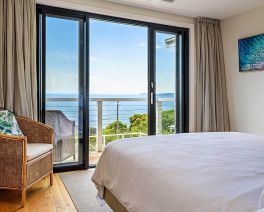 coastal retreat front porch with ocean view and blue baubles hanging above