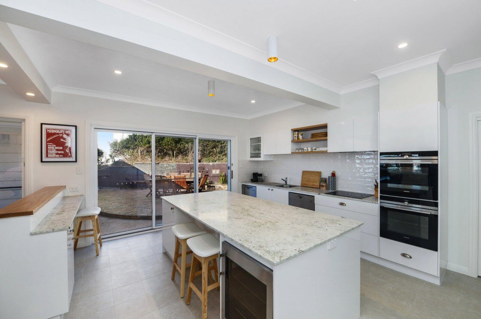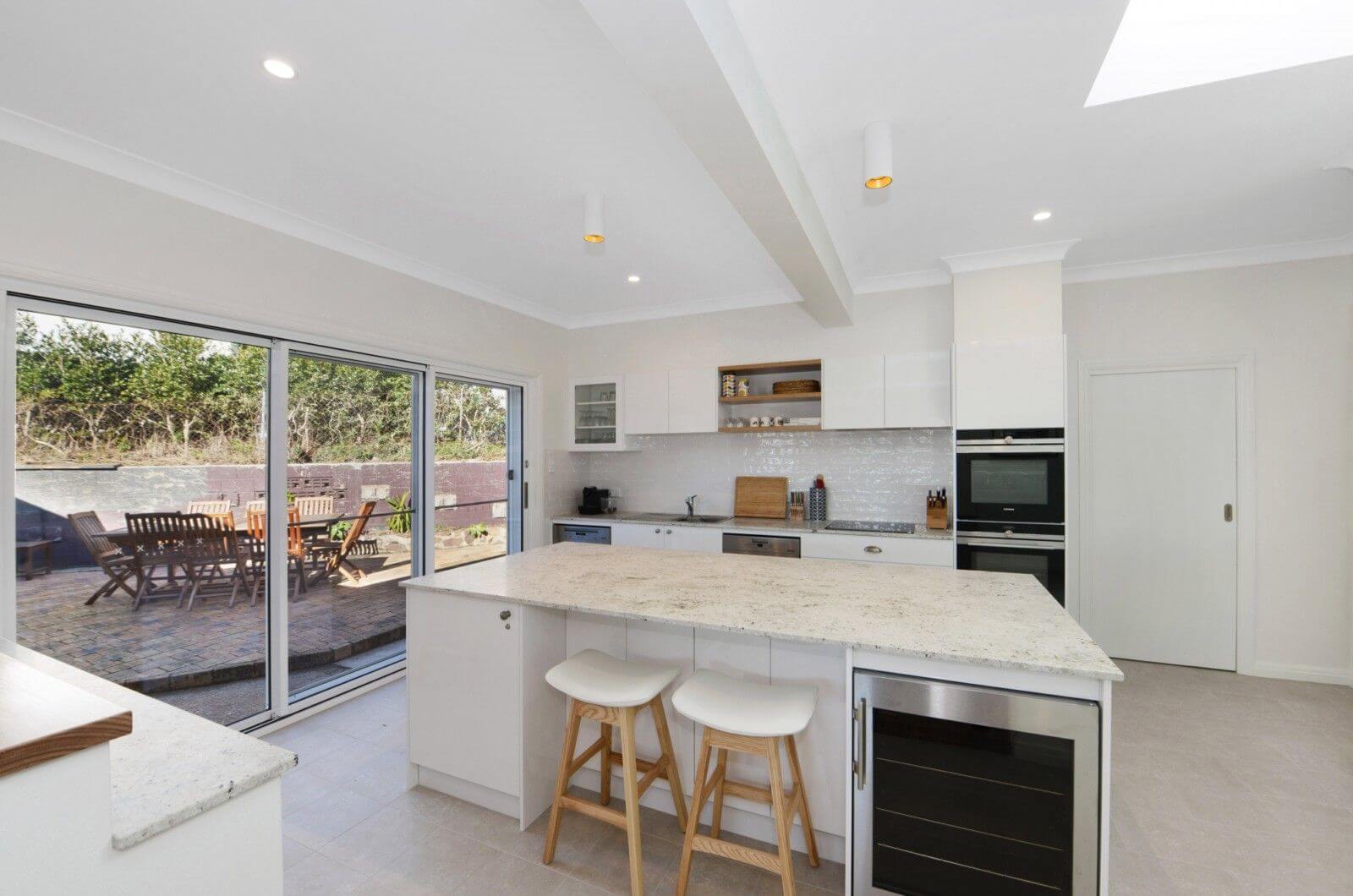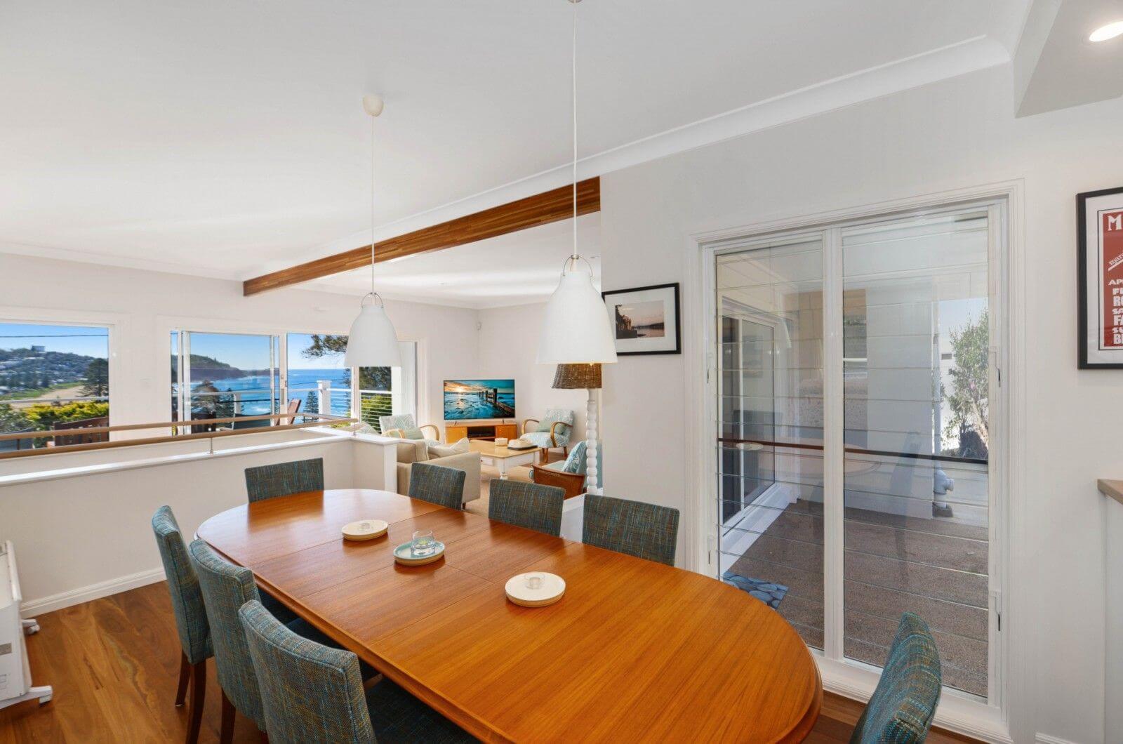 Lounge room upstairs with views over Avoca Beach and the Avoca Pines. A newly renovated kitchen has granite bench tops, a huge island bench with seating, two ovens, two dishwashers and a wine fridge, pantry and appliance cupboard to manage cooking and entertaining for a crowd or large family. A good size balcony at the front of the house to enjoy a pre dinner drink overlooking the beach.