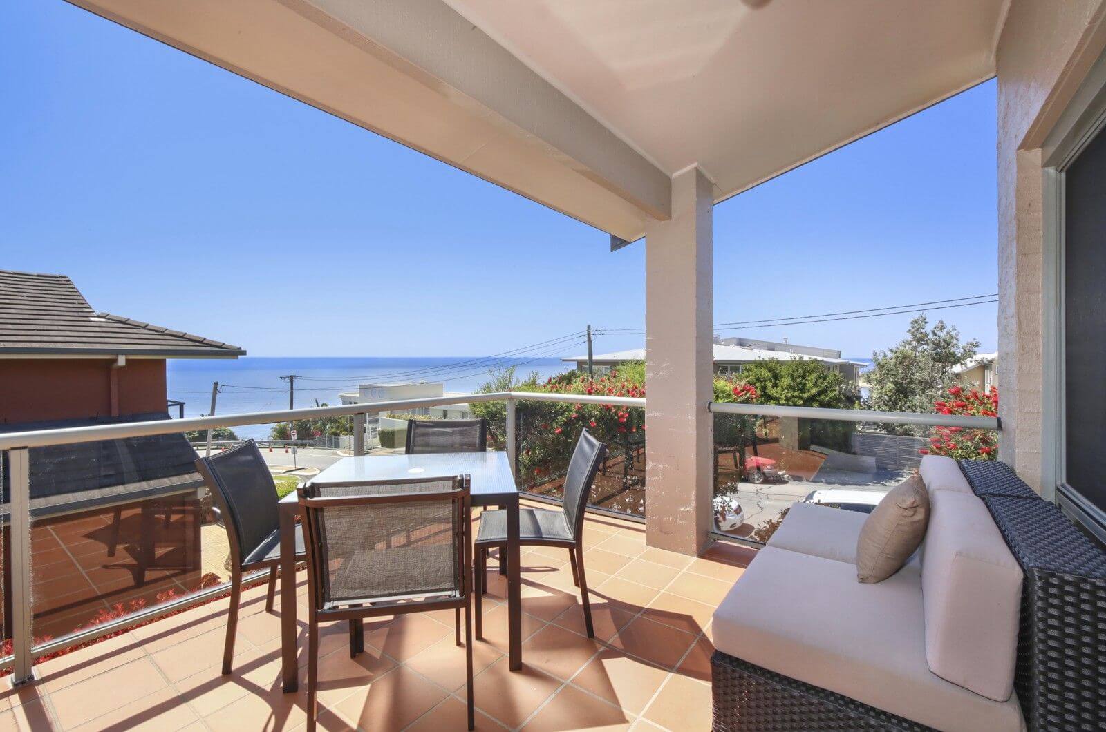 * Partially covered balcony with ocean views, outdoor table and lounge