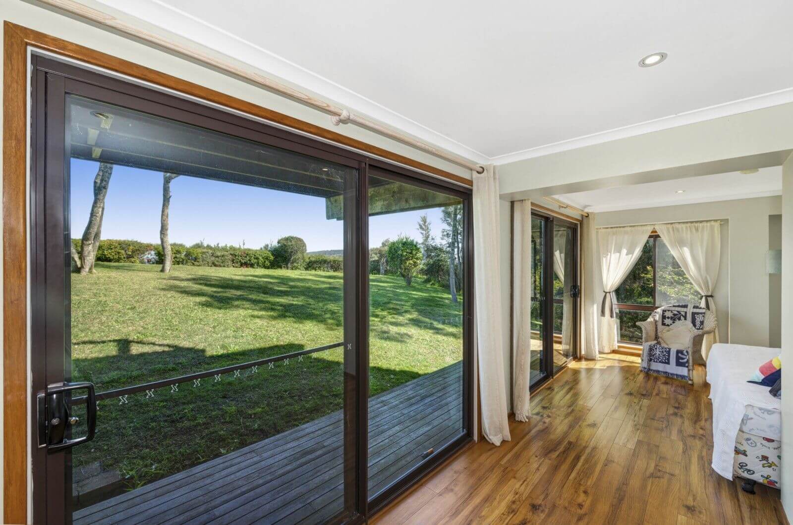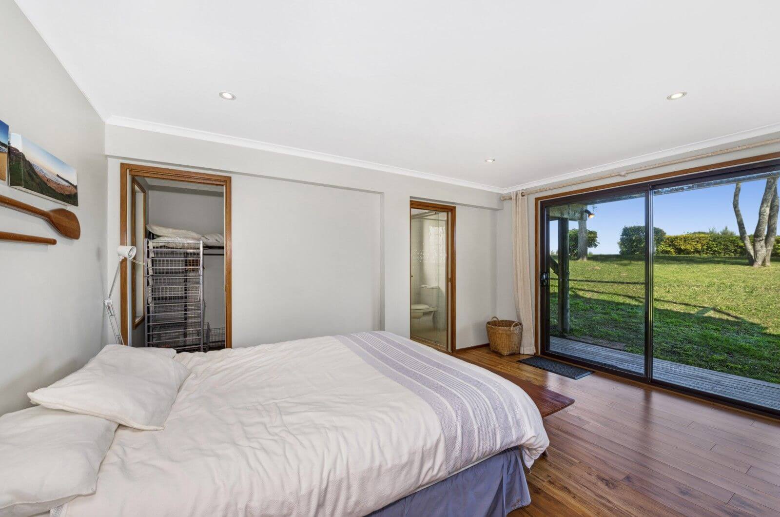 Main bedroom has a queen size bed with a separate sitting area, bedroom two has a queen size bed, bedroom three has two singles. Linen not provided. Downstairs is a modern bathroom with spa bath and another toilet. Laundry also downstairs.