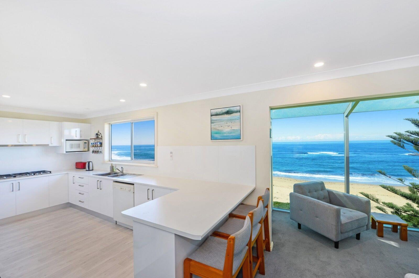 Holiday rent a seven bedroom beachfront house, or rent separately the upstairs section consisting of three bedrooms.